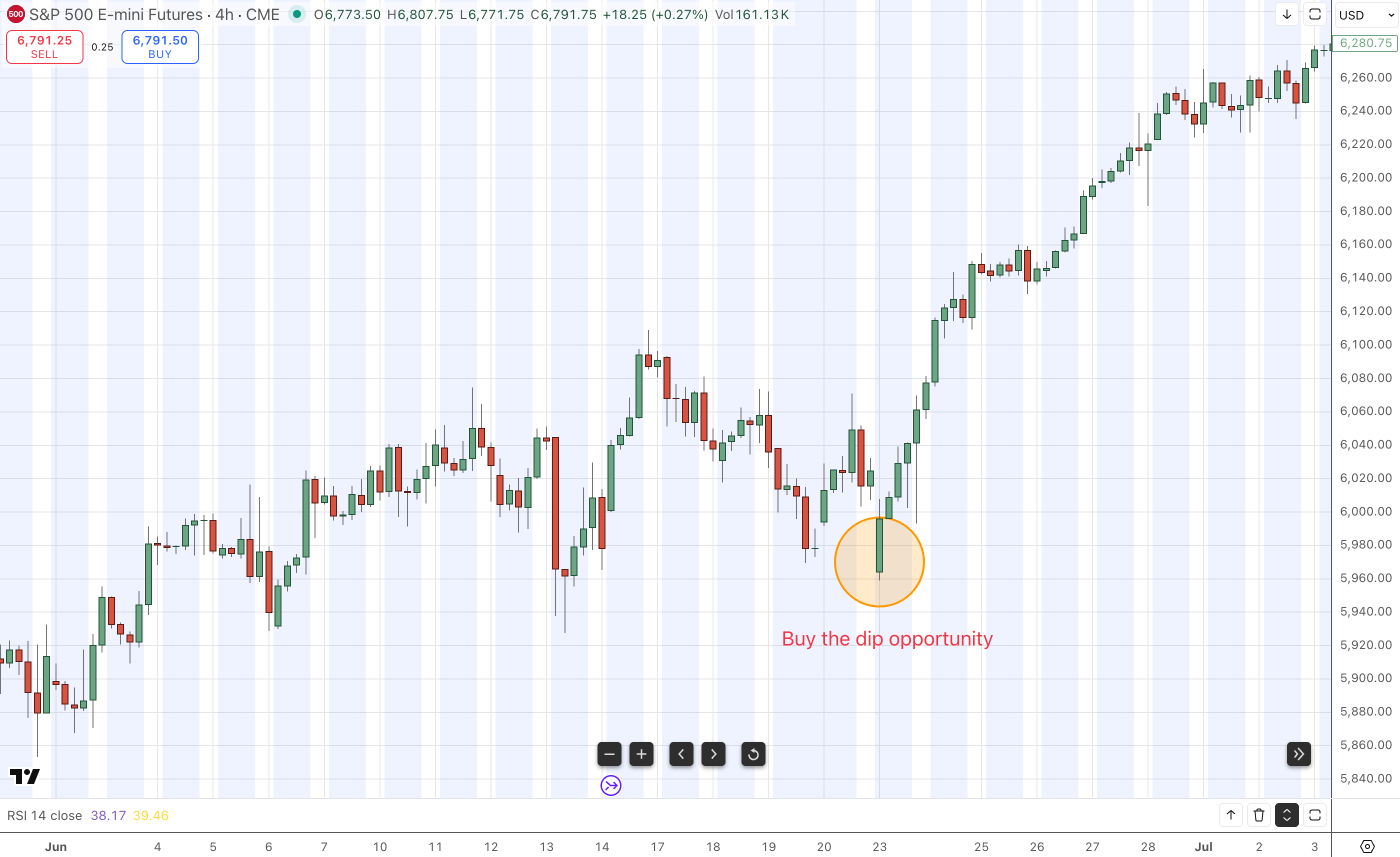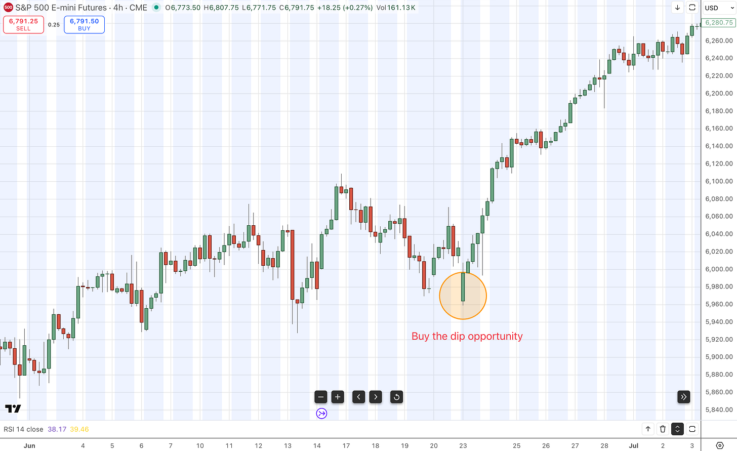 The 363-point gain from the geopolitical short was an outlier. Geopolitical risk premiums usually fade quickly and dips are bought. For example, the Israel-Iran tensions that briefly lifted oil and pressured ES in late June quickly reversed. After the U.S. strike on Iran over the June 21 weekend, ES opened lower on Monday. I bought ES and sold oil on the open, expecting that Iran would not blockade the Strait of Hormuz and that the strike would end the escalation. That view played out, and equities rallied sharply afterward.