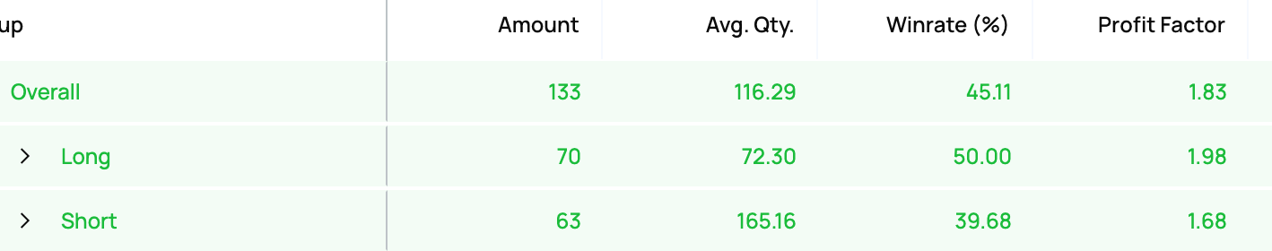 Profit factor is a performance metric that measures how profitable a strategy is relative to its risk. Greater than 1 means it’s profitable and less than 1 means it’s unprofitable. It’s calculated by dividing the pnl of all winning trades by the pnl of all losing trades.