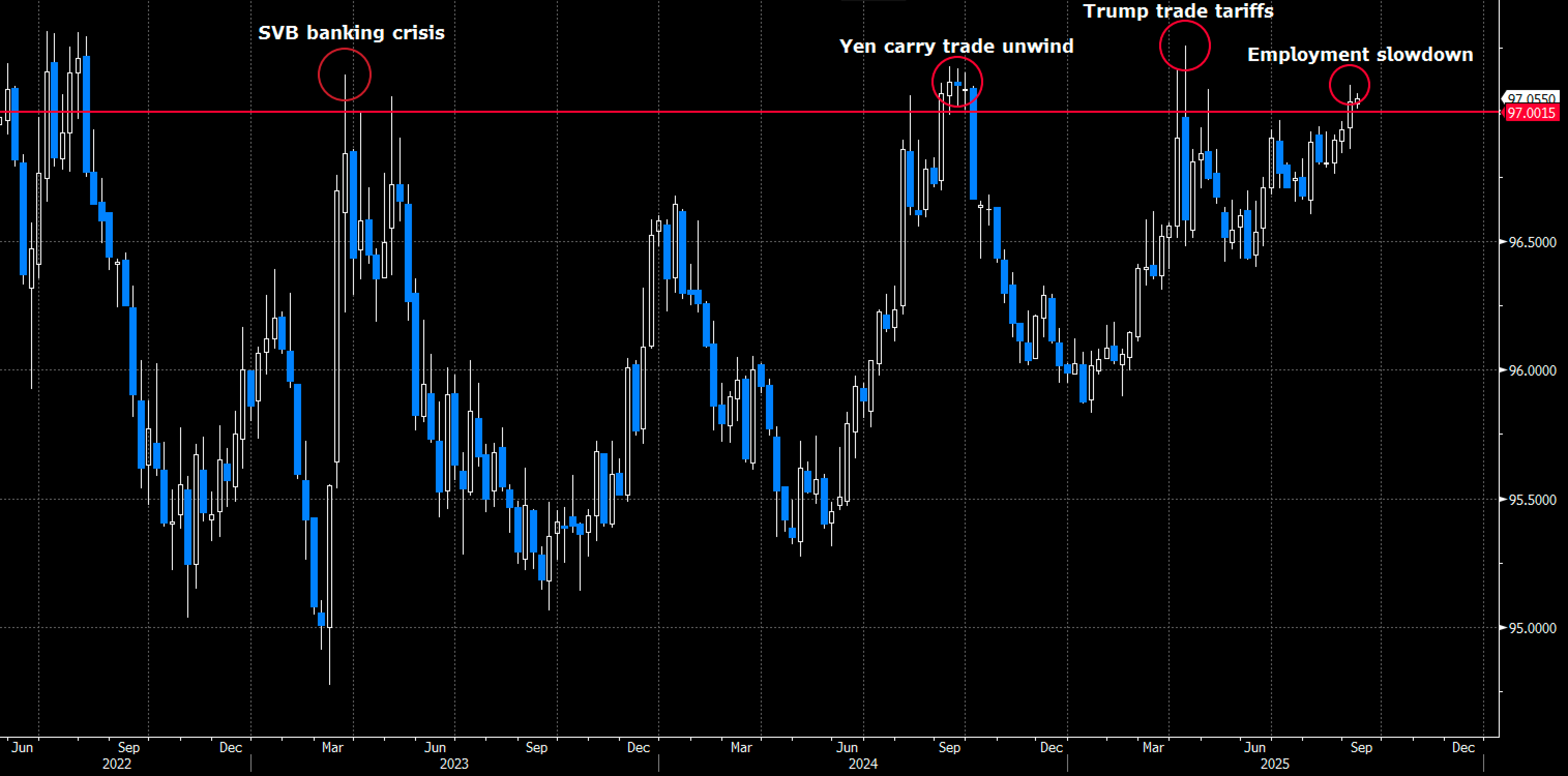 The recent weak employment data has ushered in another growth scare in the US - the fourth growth scare since the inflation spike and aggressive rate cuts of 2022. I define growth scares as periods when the probability of recession increases and the rates market prices in a drop in the terminal rate Fed funds rate to 3% or lower. The scare can be caused by endogenous factors such as restrictive monetary policy or exogenous factors such as a regional banking crisis (Silicon Valley Bank) or trade tariffs. In hindsight, each “scare” ended up being nothing more - just another bump in the business cycle that provides the market an opportunity to buy the dip in risk assets. The chart below shows the generic 6th SOFR futures contract (where the market thinks SOFR rates will be six quarters out) has done over the last three years - a representation of how the terminal rate has reacted to previous growth scares.