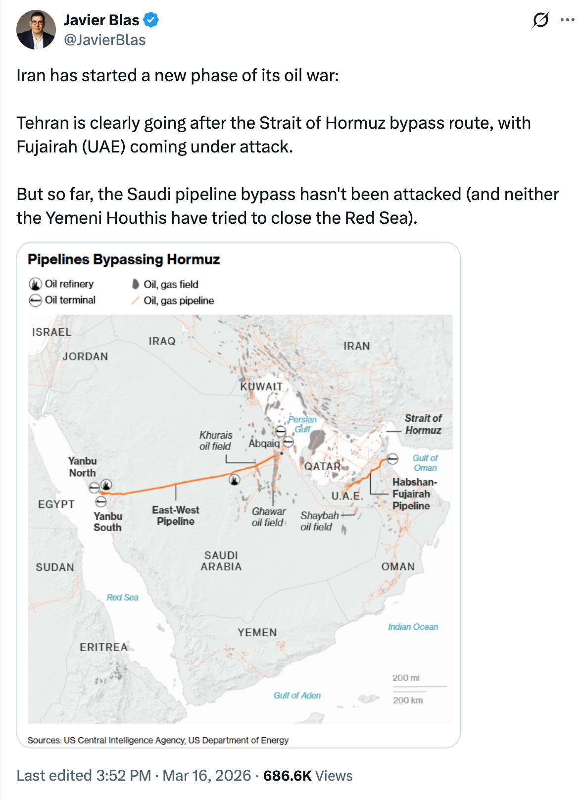 With the few projectiles that Iran is firing, they are targeting the Strait of Hormuz bypass route that allows 7mbpd bypass the SoH via the East-West pipeline. If they successfully damage it, that would be very bad for oil supply.