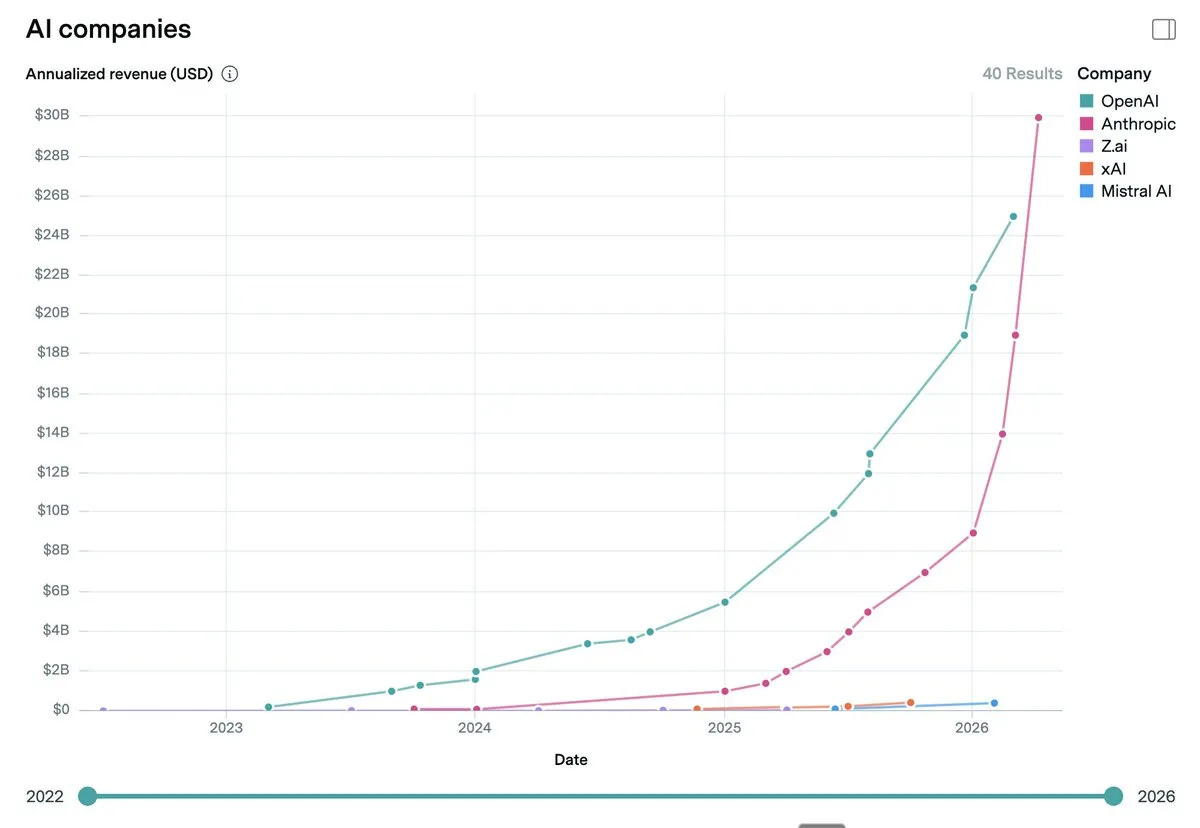 Anthropic’s annual revenue run rate has surpassed that of OpenAI despite having raised less.